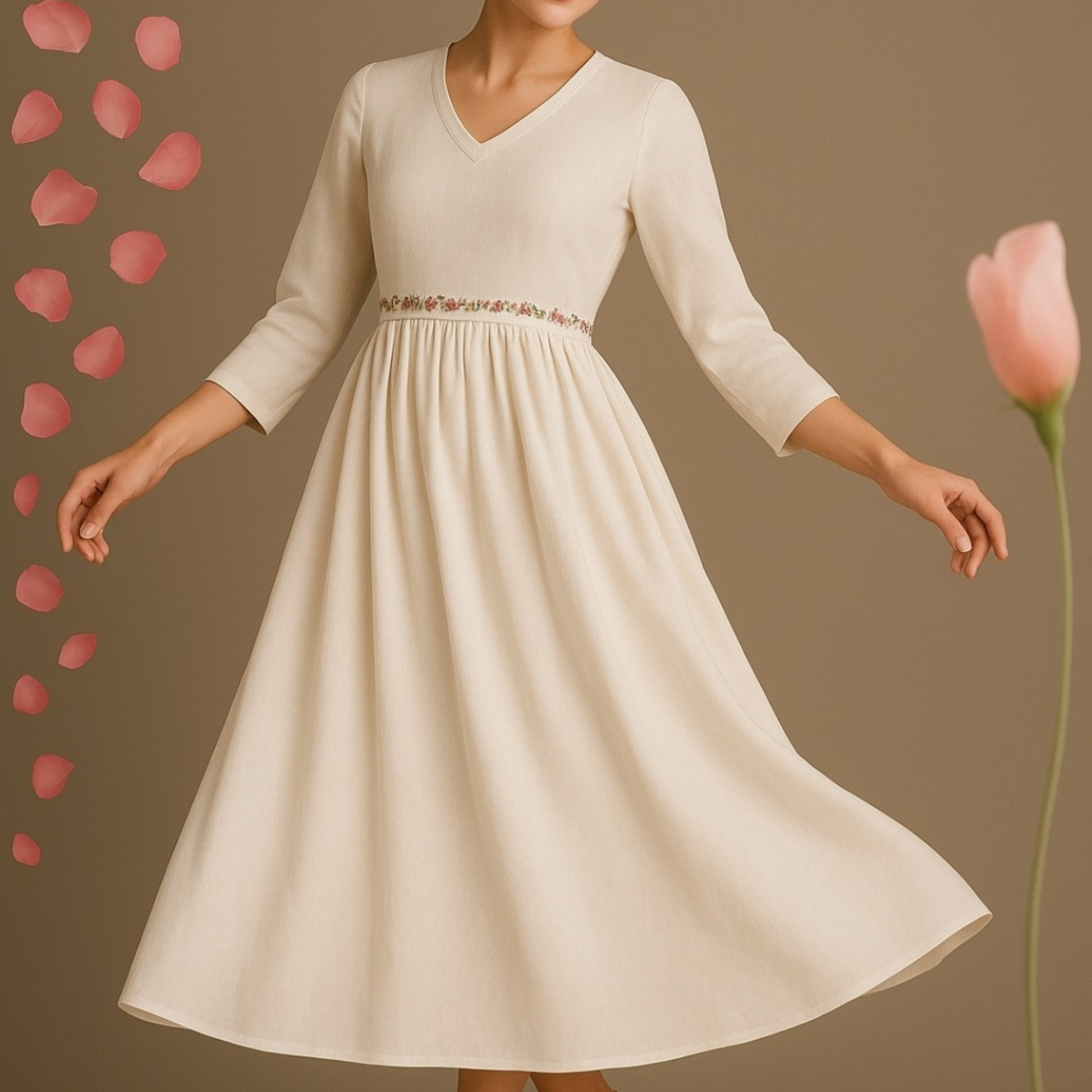 White V-Neck Midi Dress with Embroidered Waistline - Lataree