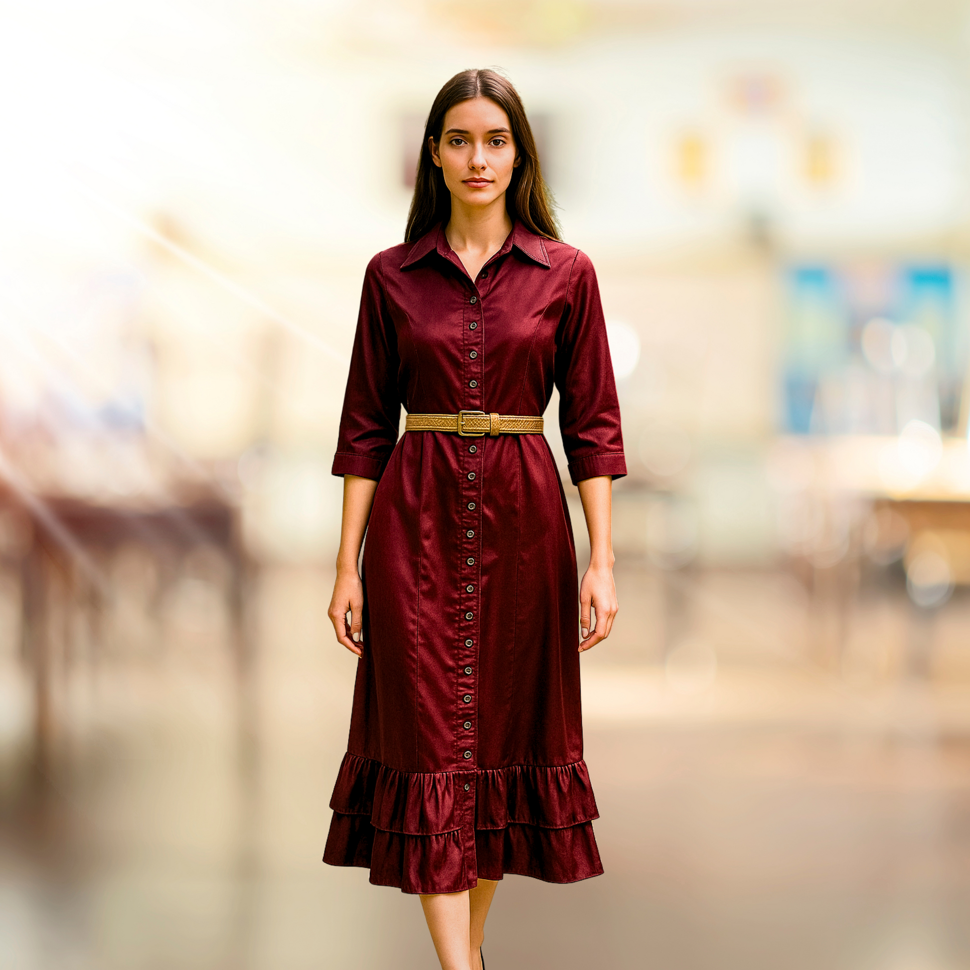 Add sophistication to your wardrobe with LATAREE’s maroon button-down midi dress. Featuring a stylish ruffle hem and 3/4th sleeves, this dress for women is crafted from gentle, high-quality fabric for all-day ease. Its distinctive, non-repeated design makes it perfect for semi-formal events or casual outings. Affordable elegance meets modern flair — shop this exclusive piece today!