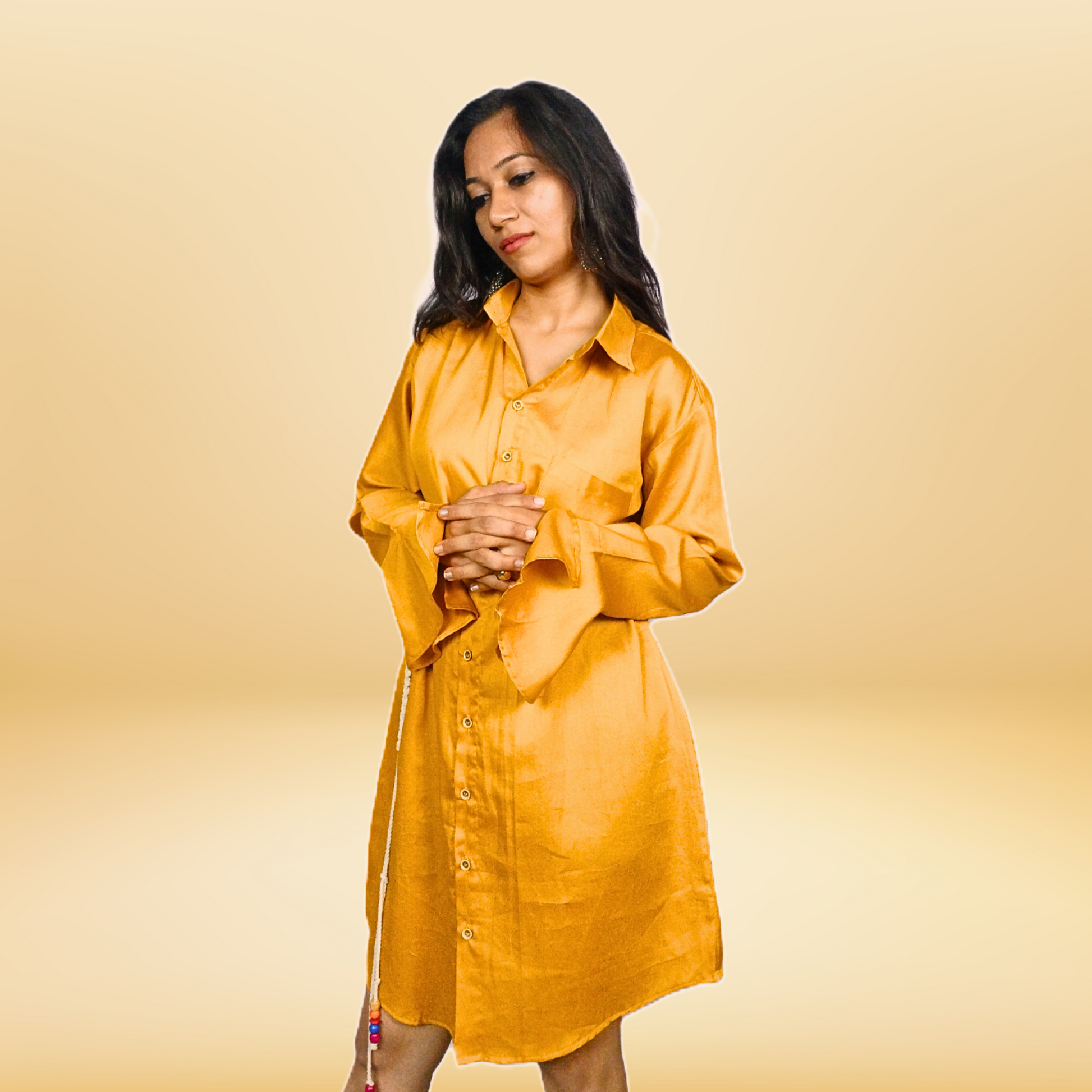 Crafted in a luxurious satin-finish cotton blend, the LATAREE Shirt dress brings a radiant twist to classic shirt styles. The golden mustard hue flatters all skin tones, while the bell sleeves add a subtle statement.