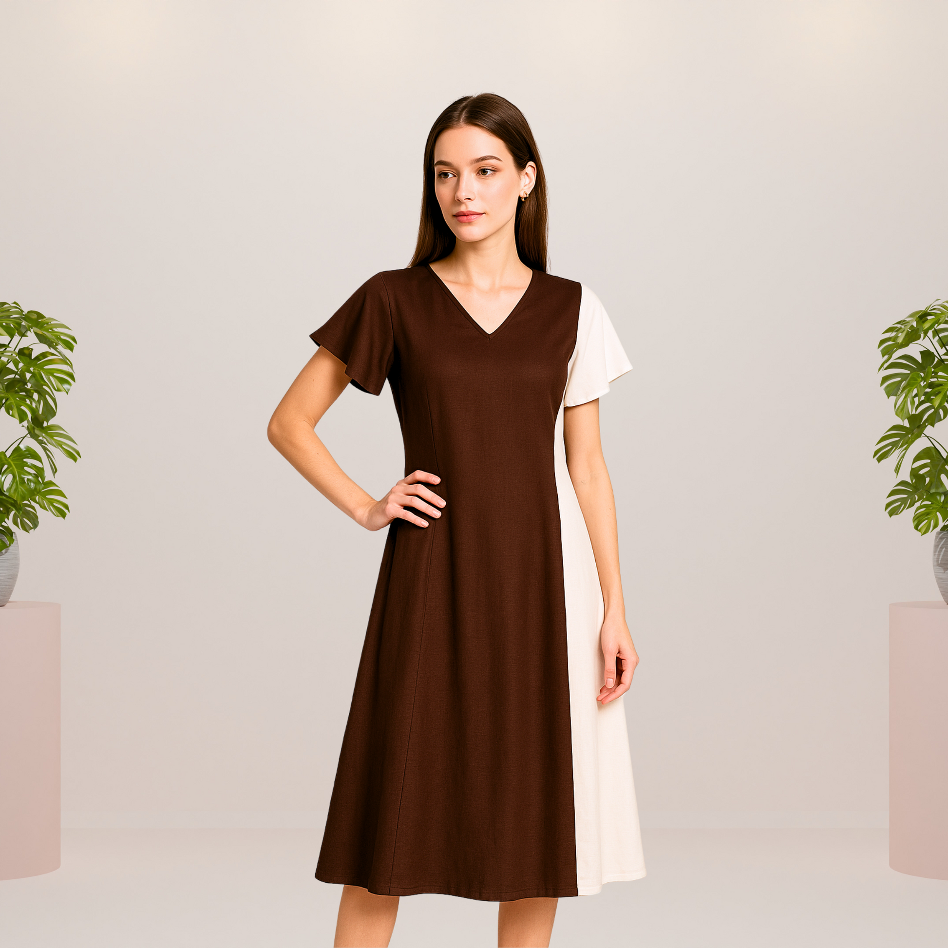 Elevate your wardrobe with LATAREE’s Coffee Brown & White Panel Dress, designed to make a bold statement with its striking dual-tone contrast.